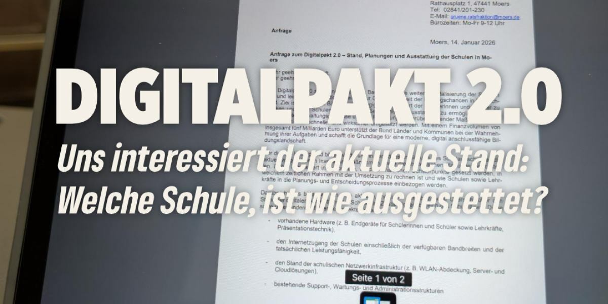 Auch wenn der Digitalpakt 2.0 aktuell noch nicht vollständig finalisiert ist, darf das kein Grund sein, abzuwarten. Gerade jetzt muss die Stadtverwaltung die notwendigen Vorarbeiten leisten, damit Moers sofort handlungsfähig ist, sobald die Mittel freigegeben werden.