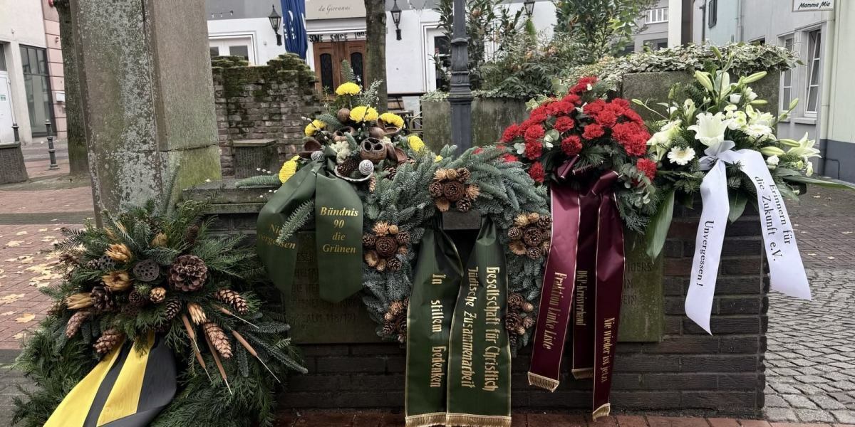 Nach einem Gedenkgottesdienst führte der gemeinsame Weg zum Mahnmal am Synagogenbogen. Dort gestalteten Schülerinnen und Schüler mehrerer Moerser Schulen die Gedenkstunde mit mahnenden Wortbeiträgen und verlasen die Namen der Moerser Jüd:innen, die ermordet und verschleppt wurden. Kränze und Rosen erinnerten still an sie und mahnten zum Innehalten.