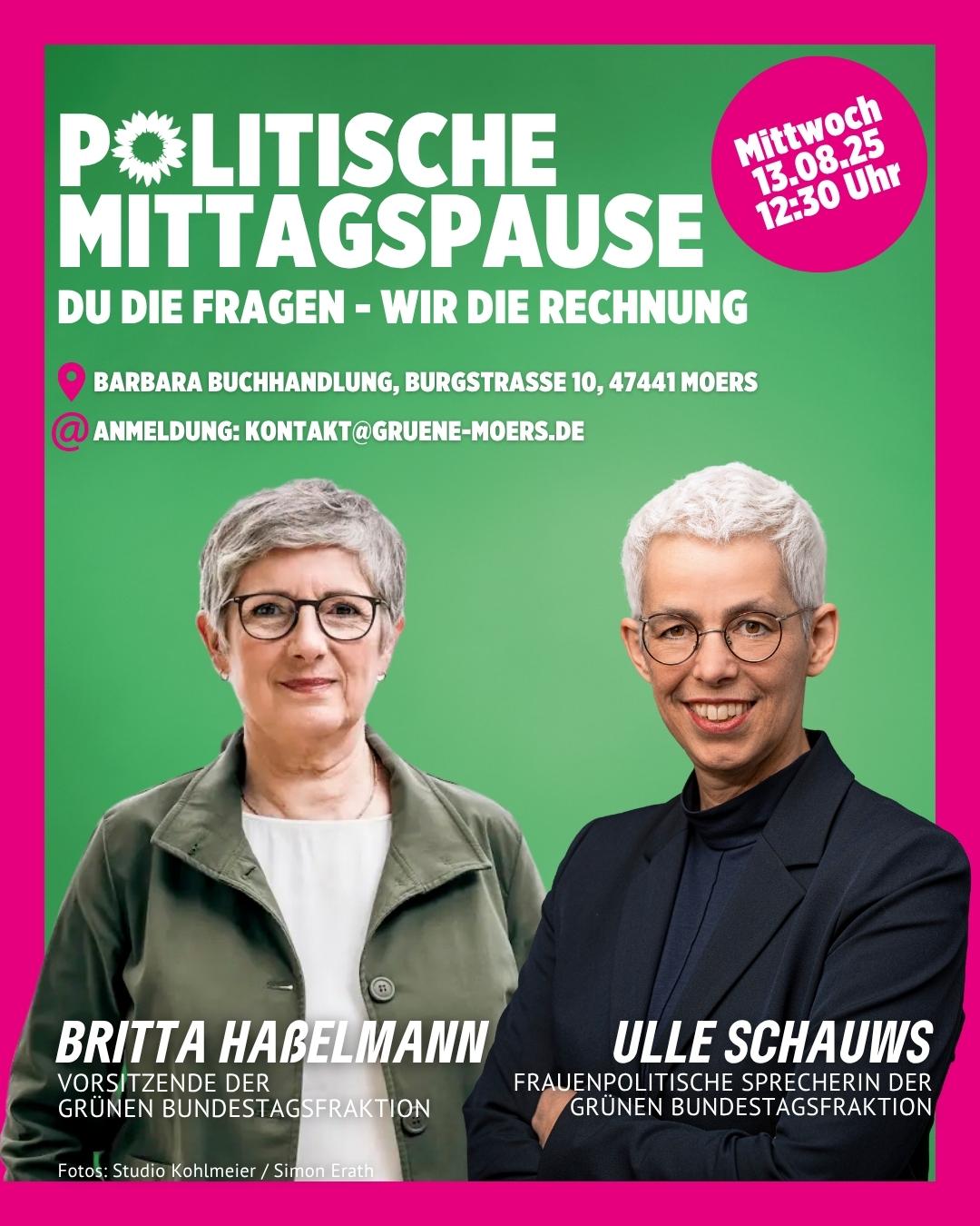 Du die Fragen - wir die Rechnung! Am Mittwoch, den 13.08.25 um 12:30 Uhr laden wir zur politischen Mittagspause. Die Fraktionsvoritzende von Bündnis90/Die Grünen Britta Haẞelmann und die Frauenpolitische Sprecherin der Bundestagsfraktion Ulle Schauws sind für euch vor Ort.