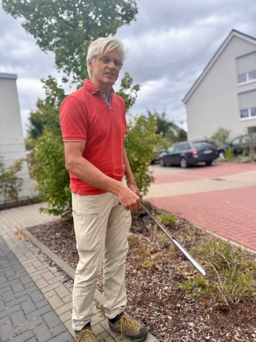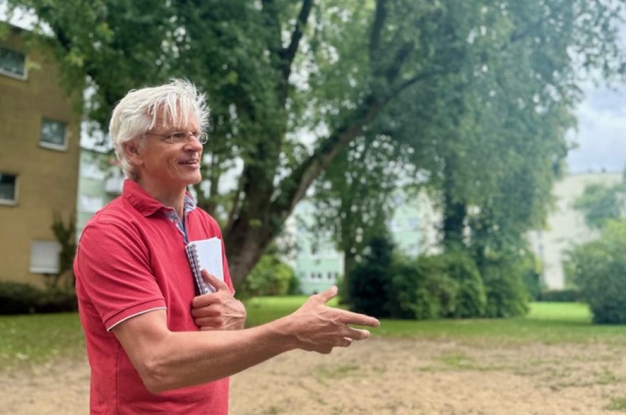 Bild 3: Im alten Siedlungsbereich zeigt sich: Bäume schützen vor Hitzestress und steigern die Lebensqualität – Stadtförster Norbert Bösken erklärt die Unterschiede zum Neubaugebiet.