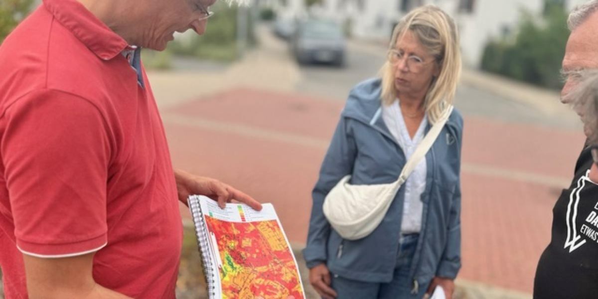 Titelbild: Ein Blick in die Klimaanalyse Moers 2024 des Regionalverbands Ruhr zeigt: Rote Flächen markieren deutliche Hitzeinseln – auch in Moers. Stadtförster Norbert Bösken erläutert die Ergebnisse gemeinsam mit Gudrun Tersteegen und interessierten Bürger*innen.